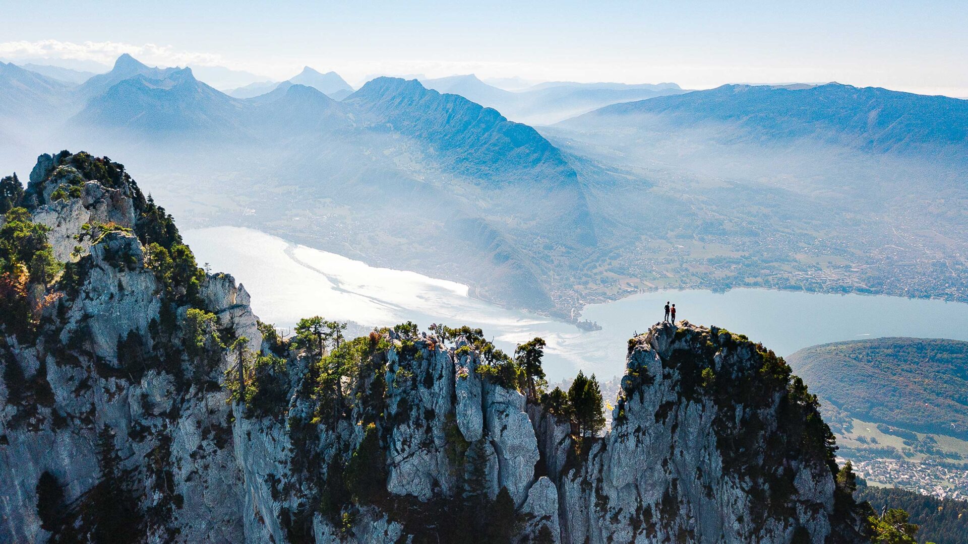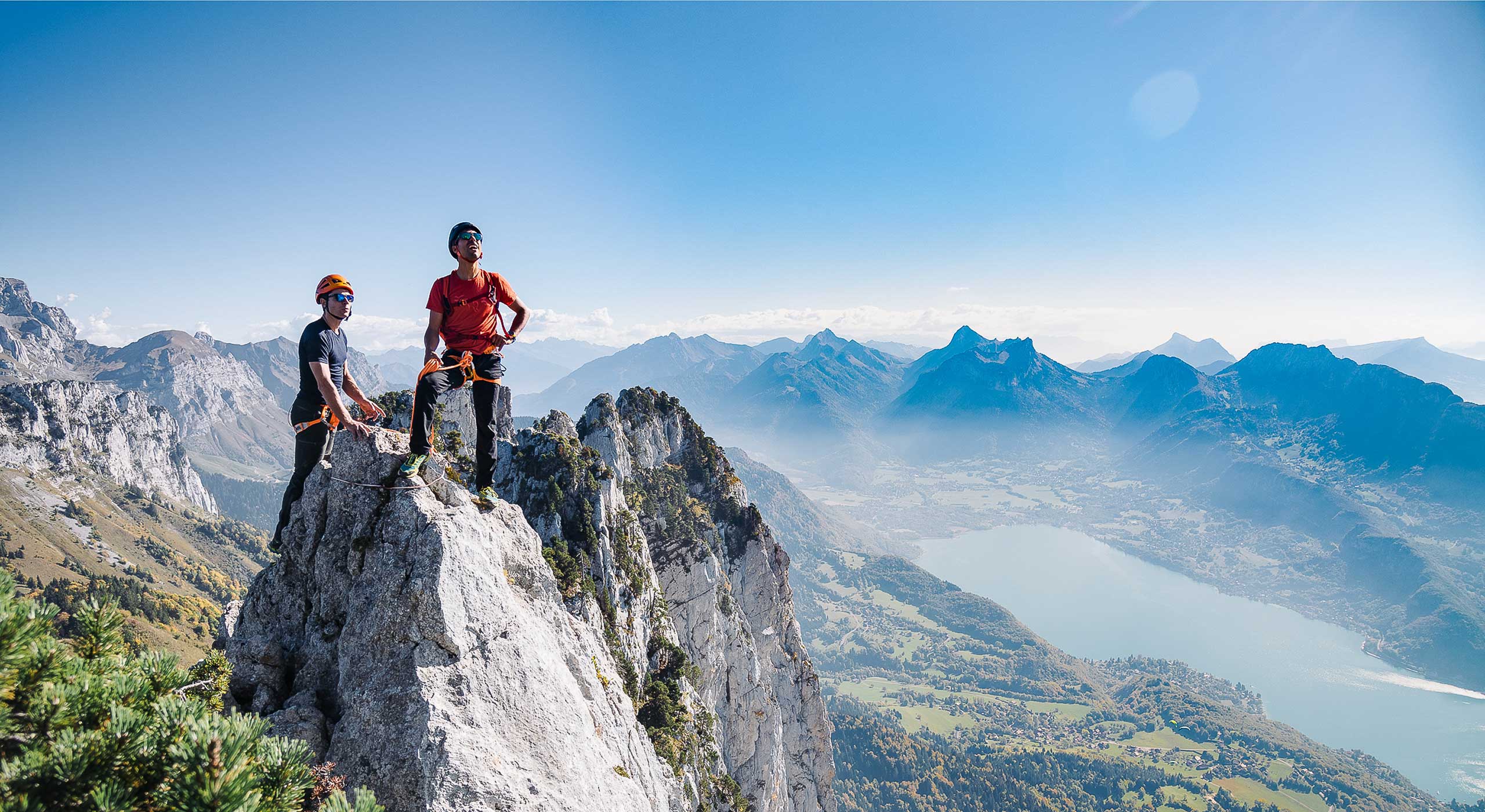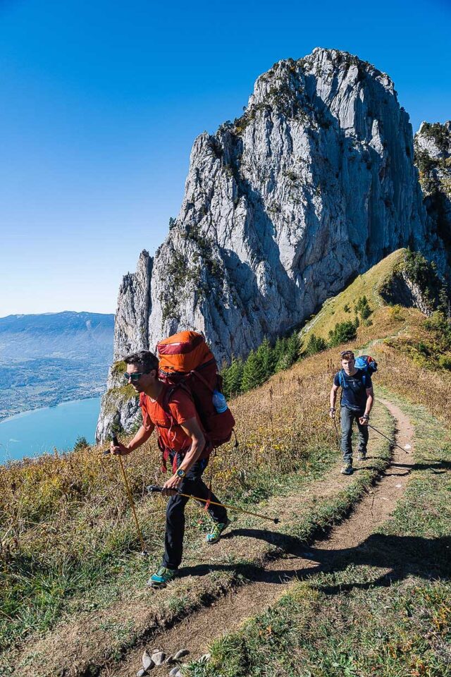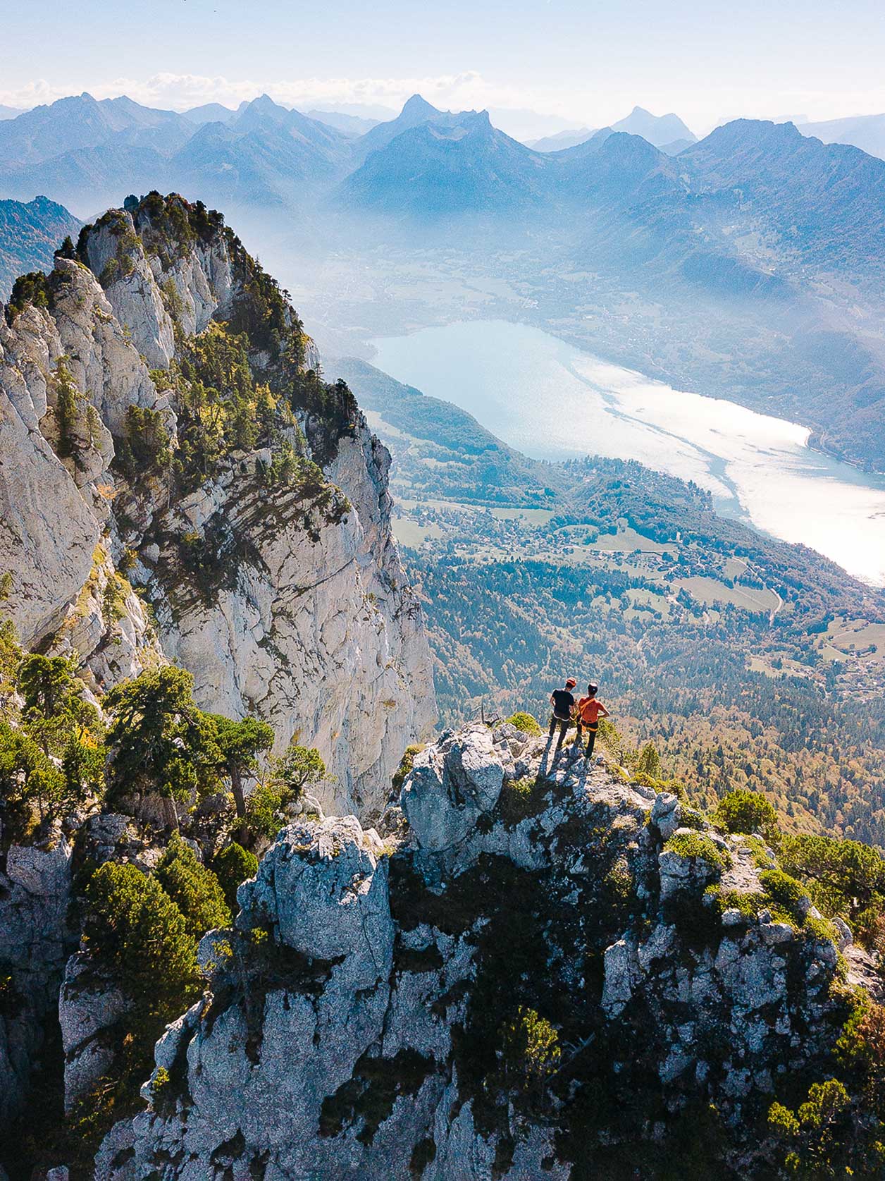 Nous passons sans transition des champs au rocher et l’escalade, bien que facile, a bel et bien commencé. Après un départ côté nord, l’arrivée au collu entre la dent sud et la partie occidentale de la traversée est un ravissement. Les pins à crochets tourmentés par les éléments amènent une saveur méridionale au décor. Derrière nous, le mont Blanc, sur notre gauche, la Tournette et sous nos pieds… les Calanques ! Seule la barrière du Semnoz rappelle que le lac a ses limites, et que notre Méditerranée n’est que d’eau douce. À mesure que le sentier se transforme en escalade à travers les pinacles rocheux qui constituent toute la dentelle des Dents de Lanfon, le regard de Jean évolue. Sortir de sa zone de confort, prendre des risques, s’engager, avoir le goût du partage et de la beauté des formes… les analogies entre nos deux mondes sont légion. J’ai l’intuition que cette sortie symbolise la naissance d’une cordée et qu’il y aura d’autres ascensions partagées. Nous poursuivons le parcours entre action et contemplation. Aucun de nous n’est rassasié de la vue incroyable dont nous gratifie ce sentier du vertige.