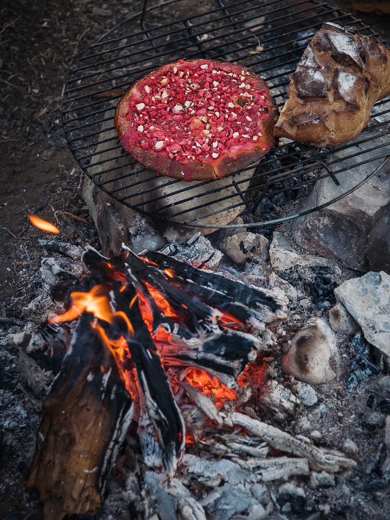 Le soleil disparaît derrière le Semnoz au moment où retentit le son rond et chaleureux du liège que l’on libère de sa tension. Nous poursuivons la balade, culinaire cette fois-ci. Ce qui me surprend le plus, au-delà de la qualité des ingrédients et des sauces qui les mettent en relief, c’est l’attention portée à chaque élément qui compose l’assiette. Aucun détail n’a été laissé au hasard ou n’a souffert d’une approximation. Une belle invitation à mettre de la conscience dans l’art de manger. Un dessert pour clôturer un tel festin ne semble pas nécessaire. À moins que… “Je ne finis jamais un repas sans une petite touche de sucré !” Déculpabilisé, je relaie les mots du chef ! Nous savourons, juste avant d’aller retrouver notre modeste couchage, une tarte aux poires façon amandine et un saint-genix généreux en pralines, à peine doré par les braises en déclin.
