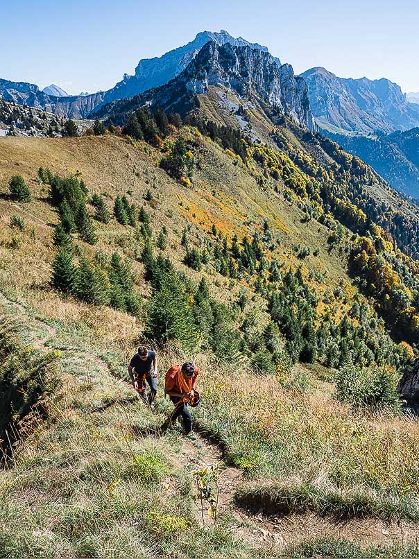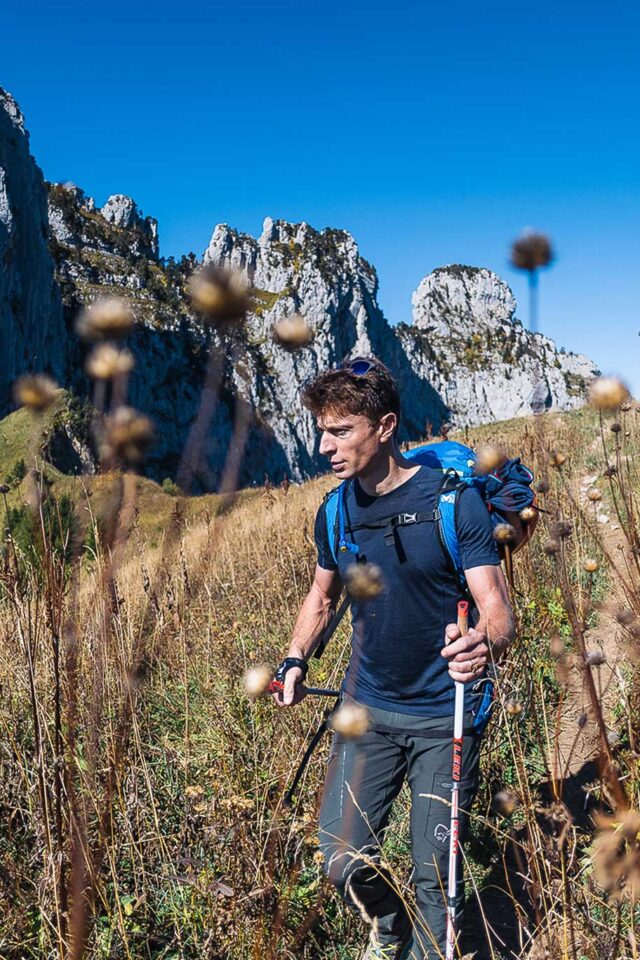 L’enthousiasme de Jean est communicatif, je perçois que l’échappée belle que nous allons vivre est un véritable luxe au regard de l’emploi du temps et du rythme qui sont les siens. Tous les midis et tous les soirs, c’est un « véritable marathon » qu’il faut pouvoir tenir. Je comprends mieux pourquoi notre sortie prend des airs de parenthèse enchantée. Malgré le poids de nos sacs, nous marchons à un bon rythme. Entraîné grâce au vélo qu’il pratique le matin dès qu’il le peut, Jean semble avoir trouvé dans le sport une soupape nécessaire avant le service. Je le sais à l’aise en endurance, sur une bicyclette ou sur des skis mais qu’en est-il du rapport au vide ? Car, au programme de la journée, après avoir déposé nos affaires de bivouac au col des Frêtes, j’envisage une traversée des Dents de Lanfon un peu revisitée… à ma sauce, cette fois-ci ! Sur le chemin, dès les premiers lacets, Jean remarque des herbes et des fleurs qu’il utilise en cuisine. Il évoque des associations de saveurs, des idées. Et si, de notre balade, pouvait émerger une nouvelle recette ? Ce serait magnifique… En le voyant évoluer en montagne, je comprends que c’est un chef qui s’inscrit dans le territoire par ses choix d’ingrédients, mais aussi par sa pratique de la montagne et sa perception du relief. Aujourd’hui, il prend le temps de s’élever “au-dessus de l’assiette”, d’aller voir en haut, de remonter à la source.