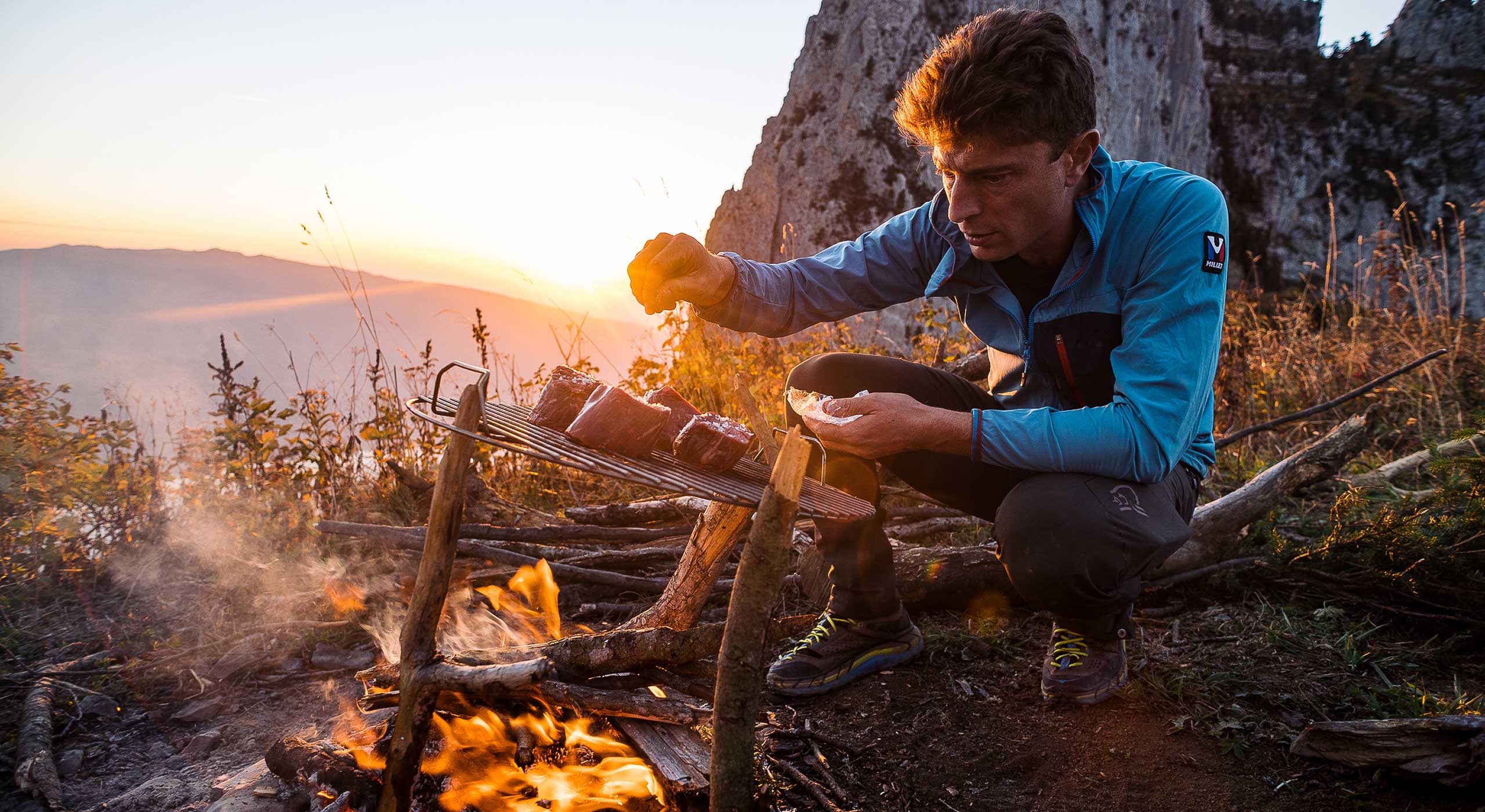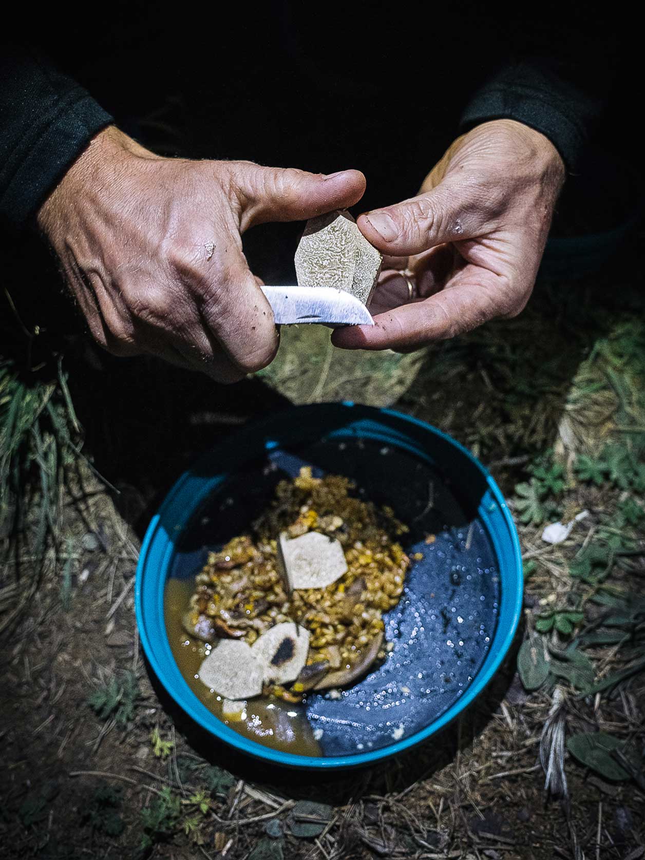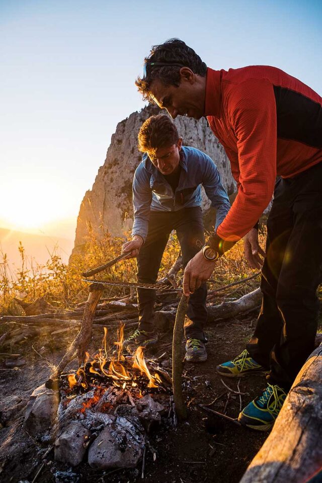 De retour au col, il nous faut ramasser suffisamment de bois pour le tapis de braises qui nous servira de gazinière. Cette fois-ci, les rôles sont inversés, je suis aux ordres du chef. Je laisse la concentration redescendre, alors que lui rallume son regard brillant en découvrant avec malice tous les éléments qui vont constituer notre repas de ce soir.