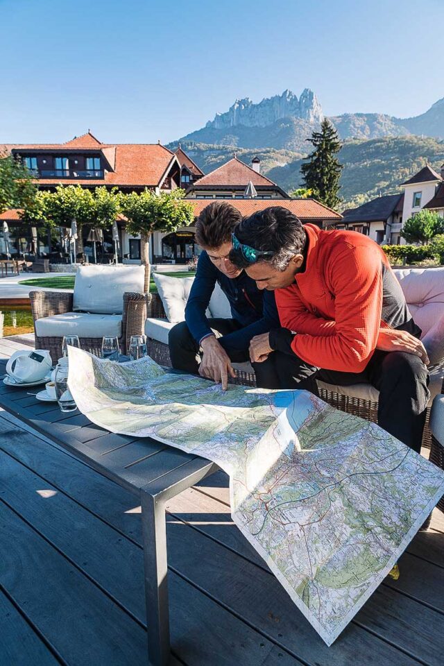 Au sol, une immense malle isotherme remplie de mets raffinés. Au-dessus, deux hommes argumentent. Entre le grand chef doublement étoilé et le guide, l’heure est à la discussion. À quel endroit va-t-on couper ce magnifique pâté en croûte ? Va-t-on prendre une ou deux bouteilles des merveilleux vins de Savoie qui jonchent le sol ? Est-il raisonnable de monter ces trois desserts ? Jamais un repas de bivouac n’aura tant fait rêver. Sur le parvis de l’auberge du Père Bise, Jean Sulpice, plein d’enthousiasme et de générosité, souhaiterait nous faire découvrir toute sa carte. Bien loin de mon domaine de prédilection, à court d’arguments et rattrapé par la gourmandise, je m’incline. Qu’à cela ne tienne, nous porterons ! Quelques instants plus tard, attablés au bord de l’eau dans le parc de l’auberge où se mêlent les houppiers d’arbres magnifiques, centenaires pour la plupart, nous déplions la carte IGN du lac d’Annecy. Nos regards sont focalisés sur une des montagnes les plus emblématiques de la région : Les Dents de Lanfon. Ce qui caractérise la pratique de l’alpinisme et de la montagne en général, c’est la place du rêve qui précède l’action. La carte, comme en cuisine, en est un trait d’union. Nonchalant, le temps s’écoule. Je regarde la montre, il faut y aller. Sur le parking, un véhicule détonne en particulier. L’ancienne Méhari relookée aux couleurs de l’auberge peine à accueillir nos sacs volumineux. Nous grimpons dans la vieille Citroën comme deux gamins s’apprêtant à faire un mauvais coup.