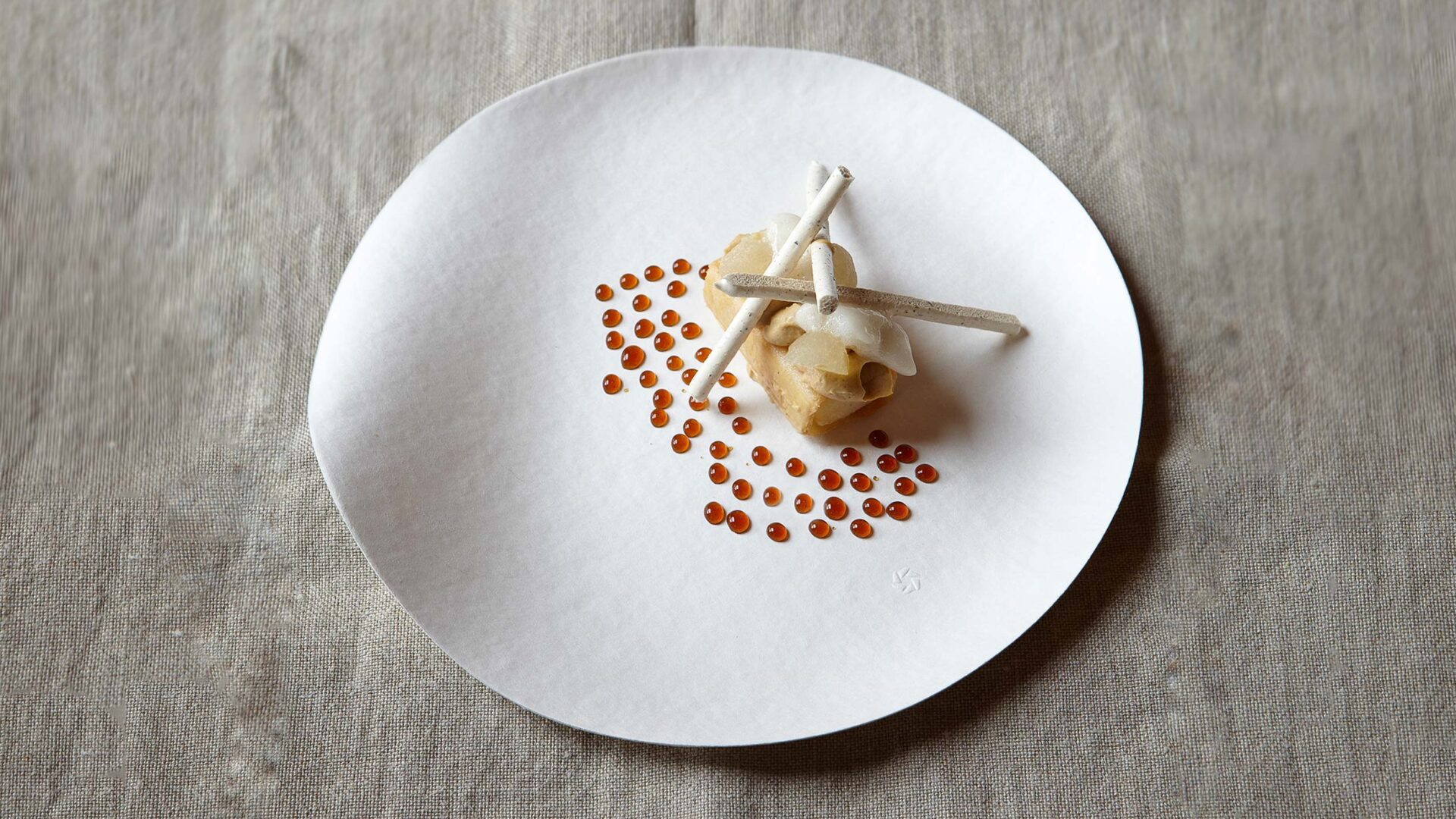 Mettre la cigarette glacée au centre de l’assiette. Disposer sur le dessus la crème pâtissière puis cinq billes de poire. Dans une autre assiette, faire un gros point de siphon poire et, à l’aide d’une cuillère, déposer l’espuma entre chaque bille. Présenter les bâtonnets de meringue en superposition. Verser la sauce citron autour de la cigarette.